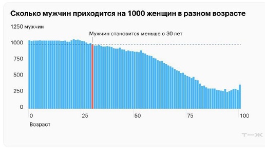 До сих пор есть живучий миф, что дефицит мужчин в России начинается с 40 лет Но нет, этот дефицит в среднем по России – с 30 лет, официально по Росстату Но и к этим цифрам надо делать поправку Так, в местах заключения свободы находится почти 400.000 мужчин (87 % преступников) Поправка нашего времени – релоканты после 2022 года тоже в большинстве своём мужчины, причём преимущественно молодого (до 35 лет) возраста Другая поправка – сотни тысяч мужчин находятся на «задаче» Потому превышение числа...