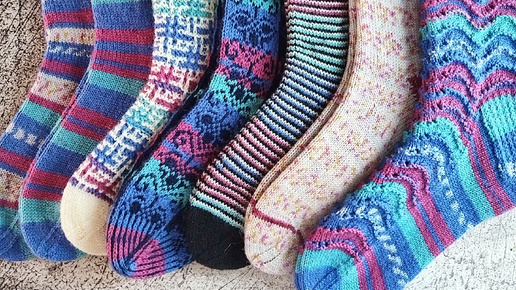 7 пар разных носков из одной секционной пряжи - показываю наглядно, для чего ее резать