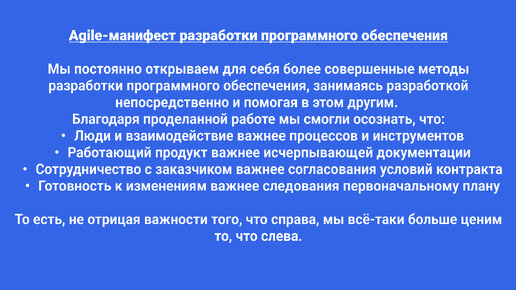 Напоминалка основных терминов Эджайл. Кому-то она поможет вспомнить, а кого-то мотивирует погуглить их значения. Картинка - для привлечения внимания. МАНИФЕСТ: < Люди и взаимодействия важнее процессов и инструментов < Работающее программное обеспечение важнее документации по нему < Сотрудничество с заказчиками важнее жестких контрактов < Реагирование на изменение важнее следования плану 12 ПРИНЦИПОВ: < Деловые люди и разработчики должны ежедневно работать вместе на протяжении всего проекта. < Самый...