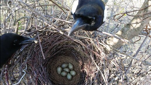 В этом году впервые за несколько лет мне встретилась пара сорок, которая хорошо "сотрудничала", то есть не боялась установленной рядом с гнездом камеры. Конечно, я воспользовался этим случаем для съемок гнездовой жизни сорок, и надо сказать, что это единственное гнездо, которое повезло доснимать с самого начала и до вылета птенцов. Ну а заодно - накопился фотоматериал по росту и развитию птенцов. Кладка в этом гнезде состояла из семи яиц. Для сорок это типично, хотя встречаются полные кладки из 3-9 яиц, а однажды довелось наблюдать за гнездом, где кладка ограничивалась всего одним яйцом...