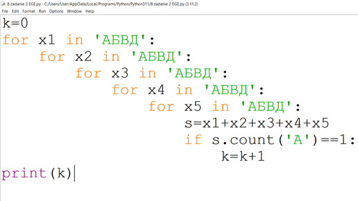 Альберт составляет 5-буквенные слова, в которых встречаются только буквы А, Б, В, Д, причём буква А появляется ровно 1 раз. Каждая из других допустимых букв может встречаться в слове любое количество раз или не встречаться совсем. Словом считается любая допустимая последовательность букв, не обязательно осмысленная. Сколько существует таких слов, которые может написать Альберт? Решение: Напишем программу на языке Python. k=0
