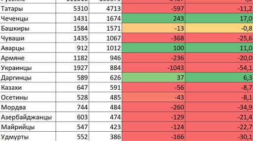 Росстат опубликовал данные по национальному составу по переписи 2021 года. Население России в целом выросло почти на 5 миллионов. Русских стало на 5,4 млн или на 4,9% меньше, их насчитали 105,5 миллионов человек (в 2010 было 111 миллионов). Татар за 11 лет стало меньше аж на 597 тысяч человек (-11,2%). Их количество уменьшилось с 5,3 млн до 4,7 млн. Численность чеченцев увеличилась с 1431 тысяч до 1674 тысячи (+243 тысячи человек или +17%)...