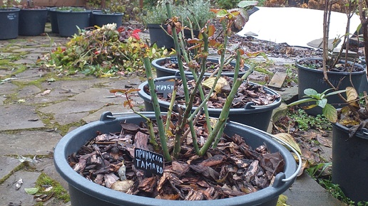 Остинки связаны вокруг своих кустов или опоры, плетистые тоже на опоре и даже с украшением (девочки же!) Контейнеров с розами 52 шт, оказалось, что размещать нужно компактно. Не все розарии подходят для достаточно объемных шестнадцатилитровых ведер, маловато королевство...) Пока контейнеры стоят, это предварительное размещение, смотрю, что и куда уместится. Перед установкой каркасов горшки улягутся на бочок "головами" на юг. В прошлом году был неправильный опыт: горшки положила кое-как...