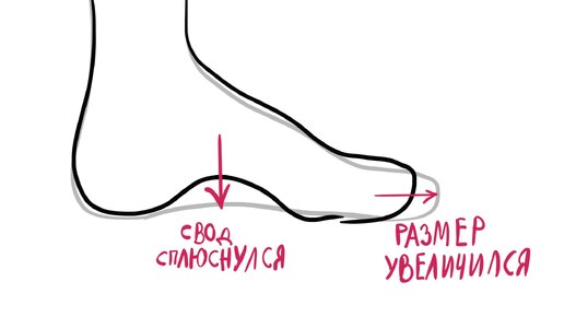 Мой ответ: с возрастом стопа может увеличиваться. Обычно это связано с уплощением сводов. Попробуйте голой рукой зачерпнуть воды из тазика. Получится такая чашечка из руки. Наши стопы тоже умеют делать такую чашечку. Это и есть свод стопы. На картинке можно нарисовать и наружные и поперечные своды. Кому что нравится. Если всем весом и очень долго наступать на эти своды, то связки постепенно могут растянуться, и своды уплощаются. Если свод стопы растаптывается, то стопа расплывается и как бы "размазывается" по полу...