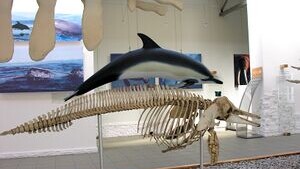 Дельфи́новые[1][2], или дельфи́ны[3] (лат. Delphinidae, от др.-греч. δελφίς, gen. δελφῖνος ‘дельфин’), — семейство морских млекопитающих из парвотряда зубатых китов инфраотряда китообразных[4][5]. Скелет (снизу) и макет (сверху) дельфина Дельфины характеризуются присутствием в обеих челюстях довольно значительного числа однородных конических зубов, оба носовых отверстия соединены обыкновенно в одно поперечное отверстие полулунной формы на вершине черепа, голова относительно небольшая, часто с заострённой мордой, тело вытянутое, есть спинной плавник...