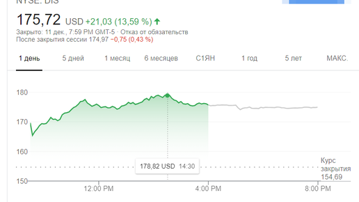 Текущая цена акций #Disney 175,7$ - Walt Disney Company (#DIS). За прошлую пятницу 11.12.2020 +16,2% до самой высокой точки дня и +13,59% по итогу закрытия...