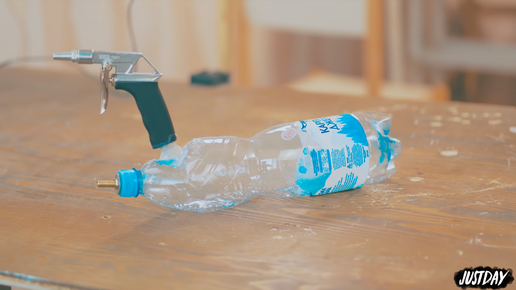 В наше время прочистить какие-либо труднодоступные места в доме вроде отверстий компьютера или клавиатуры не предоставляется возможным без баллона со сжатым воздухом. Но к сожалению у данного средства есть довольно весомый минус и это цена. Так не проще ли сделать такой баллон своими руками у себя дома и перестать тратить деньги на дорогое средство? Как раз сегодня мы расскажем и покажем как сделать данный инструмент из обычной пластиковой бутылки. Возьмите большую пластиковую бутылку, ниппель как на гифке и продувочный пистолет...