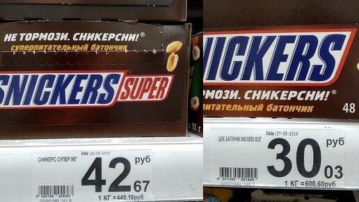 Вот за что я люблю магазин "Ашан", так это за то, что в этом магазине на ценниках указана цена не только за штучный товар, но и сколько будет стоить килограмм этого продукта. Очень интересно посчитать выгоду при покупке некоторых товаров. И вот я решил посчитать и поделиться с Вами, как выгоднее будет покупать всеми любимые шоколадки....)))) SNICKERS Сникерс маленький (50,5 грамм) - 30,03 за батончик. 600,60 за килограмм. Сникерс супер (95 грамм) - 42,67 за батончик. 449,16 за килограмм. Выгода в 151 рубль и 44 копейки...