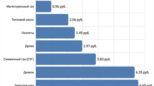 Сколько реально стоит обогрев дома в Московской области? Мы собрали актуальные для отопительного сезона 2025-2026 гг. данные и сделали сравнительный расчет стоимости тепла от разных источников для Московской области. Давайте пройдемся по списку от самого дешевого к самому дорогому киловатту и посмотрим, что стоит за этими цифрами. Цена 1 м³ — 8,37 руб. Удельная теплота сгорания G20 составляет 34,02 МДж/м³, или 9,45 кВт·ч энергии. КПД современного конденсационного котла — около 92%. Итого: 1 кВт·ч тепла за 0,96 руб...