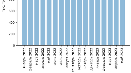 Динамика внутреннего производства серной кислоты в натуральном выражении по месяцам: Мы видим, что наибольших значений производство достигло в марте 2023 года и составило 1377 тыс. тонн. Наименьшие показатели зафиксированы в феврале 2022 года: 1153 тыс...