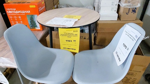 Своевременно к холодной погоде привезли эту новинку в Светофор. Пушистая опушка, тепло внутри и расцветки приятные, симпатичные.  Тапочки домашние утепленные под названием "Бабуши" по цене 327,5 руб. Размеры от 35 до 41, и расцветки можно выбрать по своему предпочтению  У самого входа встречает целая выставка разной мебели по невысоким ценам Стол круглый интрьерный, металлический каркас, столешница ЛДСП с кромкой. Д:775 мм, высота 760 мм. Цена 1501,8 рублей. Россия. Стул со спинкой, прочный, нагрузка до 120 кг...