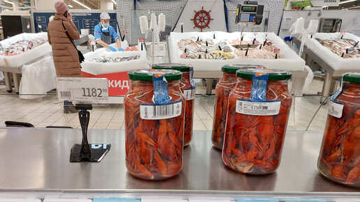 Вчера съездили в магазин "Ашан", купили некоторые продукты на Новый год, которые могут долго храниться. Покажу вам немного цен из магазина. Мы недавно покупали на рынке, недалеко от дома, свиные ноги по 250р за 1кг, здесь они стоят 160р за 1кг. Хотели взять стейки семги, но не нашли. Сначала не хотели вообще ничего брать, все стейки в охлажденном виде какие-то мелкие. А мы хотели пожарить каждому по хорошему, крупному куску. А потом прошли мимо заморозки, а там такие крупные, красивые стейки лосося лежат и даже без льда...