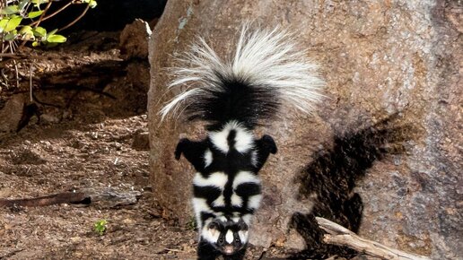 Американский пятнистый скунс: Боевая стойка на передних лапах. Если увидите такую позу, то просто бегите со всех ног не оглядываясь