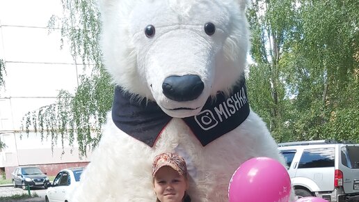 Несколько дней назад мы были на дне рождении у моей крестницы. Ей исполнилось 18 лет. Её родители наняли медведя для поздравления. Все гости приехали к указанному времени, но не стали подниматься в квартиру, а стояли возле подъезда. Именинница спустилась к нам с вопросом, почему мы тут, пойдёмте. Она же не знала про сюрприз. И в это время с громкой весёлой музыкой со стороны соседнего подъезда к нам стал шагать медведь. Он шёл с подарком и шариками в лапах, а чуть позади шёл мужчина (его коллега) с колонкой...