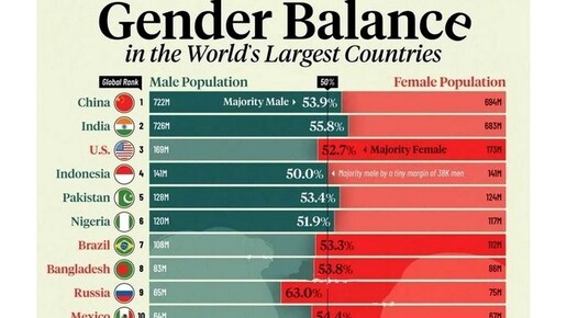 Но до определенного возраста у девушек больше шансов встретить свою половинку. То, что в России на 10 девчонок по статистике 9 ребят - известно давно. Но чтобы на 10 девчонок было всего лишь 5 ребят - эти данные статистики, возможно, будут для кого-то неожиданными. Количество проживающих в России женщин составляет 63% от общего числа населения, мужчин – 37%. Такие данные приводит издание Лента.ru со ссылкой на исследование аналитической компании Civixplorer на основе данных за 2024 год. Женское население преобладает в США, Мексике, Германии, Бразилии, Японии, Таиланде...