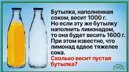 🧩 ГОЛОВОЛОМКА ДЛЯ УМА: сколько весит пустая бутылка?
