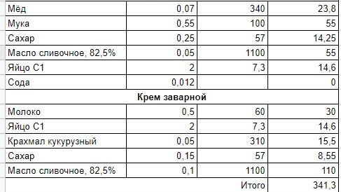 На днях пекла тортик. Задумалась, сколько же стоит 1 кг медовика в домашних условиях. А считать я люблю. Результаты в таблице. Цены брала с сайта Магнита. По этому рецепту выходит тортик около 1,5 кг...