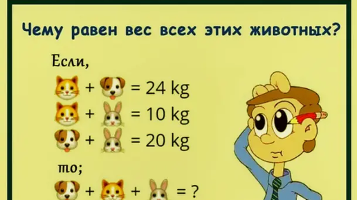 🐘 Сколько весят все звери вместе? Реши логическую загадку! Перед тобой — необычная задачка на смекалку: нужно вычислить общий вес нескольких животных. Условия спрятаны на картинке — внимательно изучи их, чтобы не пропустить ни одной подсказки! Как решать: - всмотрись в изображения и подписи — там скрыты ключевые данные; - найди взаимосвязи между весами разных животных; - составь логическую цепочку вычислений; - получи финальный ответ. 💡 Подсказка: не пытайся угадать число — ищи закономерности и соотношения...