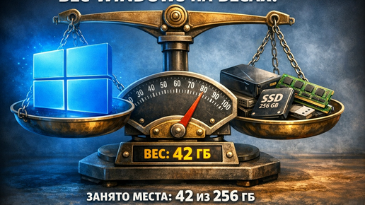 Вы только что установили свежую Windows. Система чистая, никаких программ, никаких ваших файлов. Заходите в «Этот компьютер», смотрите на диск C: и видите, что из 256 гигабайт свободно… всего 180. Куда делись 70 гигабайт? «Ну, система же весит», — думаете вы. Но сколько именно? Microsoft на своем сайте пишет про 64 ГБ минимальных требований, но на практике чистая Windows занимает совсем не 64 ГБ и даже не 30. И здесь начинается самое интересное. Ответ на поверхности: чистая Windows после установки весит в среднем 25–35 ГБ...