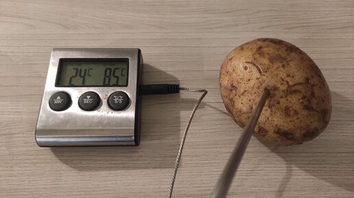 Закладываем небольшой по размеру картофель, примерно 6х4х3см, в разогретую до 180 духовку с установленным до середины щупом от термометра. Когда картофель будет готов? Нам надо добиться, чтобы крахмал перешел в стадию, когда он перестанет быть устойчивым к пищеварительным ферментам. Это начинает происходить при нагреве от 50 градусов. Но реально мягким и приятным на вкус картофель становится при температурной обработке свыше 85 градусов. В частности, в сувиде картофель рекомендуется варить час при этой температуре...