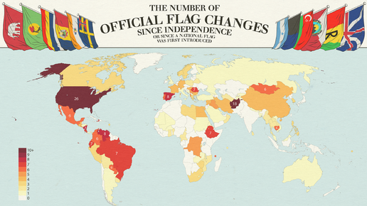 Смена флага, той или иной страной, не такое уж редкое явление, как правило, это не полноценная замена, а скорее, косметические изменения, не затрагивающие основные символы и не влияющие на узнаваемость полотна, но есть и несколько радикальных примеров. На карте показано количество изменений, происходивших с национальными флагами, с момента обретения страной независимости или со дня, когда флаг был впервые применён. Рекордсмены по числу изменений национального флага: