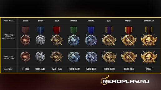 Сколько всего званий? На данный момент их всего восемь штук, ниже Вы можете посмотреть изображение, как они выглядят. Думаю больше их не станет. Как получить? Чтобы у Вас отображался ранг Вам необходимо сыграть ровно десять матчей. Некая калибровка, она присутствует во многих играх. Присваиваться медали будут за счёт очков, которые будут подсчитываться в зависимости сколько убийств сделали в матче, сколько убили в голову и так далее. Под каждым рангом Вы можете наблюдать цифры - это и есть те самые очки...