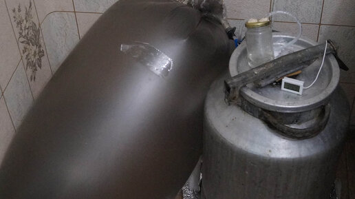 Неожиданные результаты одного интересного эксперимента. В первый два дня брага бродит очень интенсивно, с обильным газовыделением и специфичным запахом. Слабый запах может быть даже приятным, чего не скажешь о сильном запахе, когда брага находилась в течении дня в закрытом помещении. Я решил выяснить, сколько газа выделяет 1 кг сахара при перебраживании в спирт. На плотно закрытую молочную флягу был установлен водяной затор и далее газ по трубке подавался к полиэтиленовому мешку для мусора объемом 120 литров...