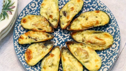 Мидии, запеченные в духовке с сырно-чесночным соусом
