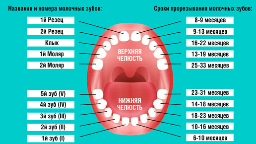 Обычно у детей появляется 20 молочных зубов. Эти зубы начинают прорезываться в возрасте от 6 месяцев до 3 лет. У каждого ребенка может быть немного различное расписание прорезывания зубов, но общее количество молочных зубов у всех одинаково.