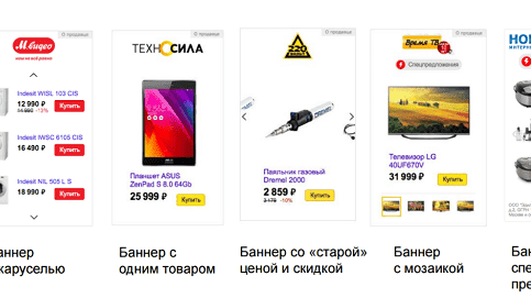 Смарт-баннеры — это медийные объявления с динамическим контентом, показывающим товарные предложения с картинкой, ценой, названием и при необходимости с акционным предложением. Виды смарт-баннеров На сегодняшний день существует несколько разновидностей данного типа объявлений, условно, которые можно разделить на: Со специальным предложением. Добавляет метку в виде молнии и короткое описание акции. Также данный вид объявлений показывается в поисковой выдаче, как и динамические поисковые объявления...