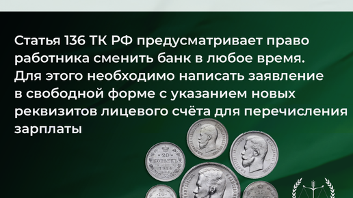 Работник вправе поменять зарплатный банк (кредитную организацию, в которую переводится зарплата) на основании письменного заявления. Работодатель не вправе отказать в этом праве, даже если в организации есть зарплатный проект с конкретным банком. 🗒 Законодательные нормы Право работника на смену зарплатного банка закреплено в ч. 3 статьи 136 Трудового кодекса РФ. Банк определяется не зарплатным проектом работодателя, не коллективным договором и не трудовым договором, а заявлением работника...