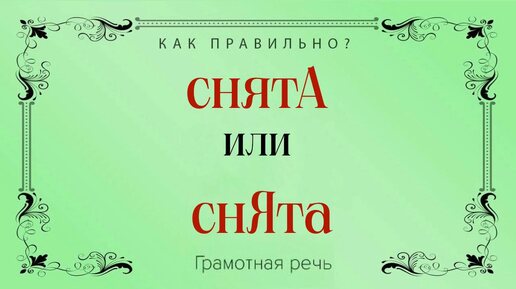 Как правильно: «снятА» или «снЯта»? Правильно говорить: снятА. Ударение в формах мужского и среднего рода, а также во множественном числе падает на первый слог: снЯт, снЯто, снЯты. Это — типичный пример непостоянства...