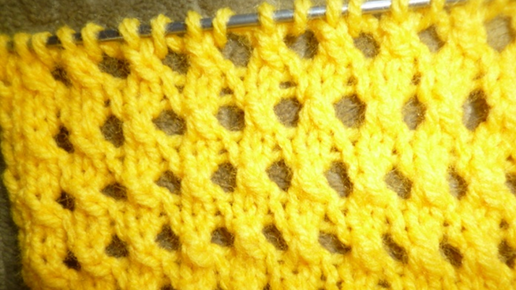 Этот прием мы применяем для вязания края изделия, зубчиков на пинетках, дырочек на изделии. А почему бы его не использовать как рисунок для вязания целого изделия. Предлагаю 3 варианта: 1. Изделие получится в сеточку. 1 ряд – лицевые петли 2 ряд и все четные – изнаночные петли 3 ряд - накид, 2 петли вместе лицевой 5 ряд – 1 лицевая, *накид, 2 вместе лицевой* Далее вязать 3-6 ряд. Узор будет выглядеть немного по-другому, если провязывать 2 петли вместе следующим образом: 1 петлю снять, 1 лицевая, протянуть провязанную петлю через снятую...