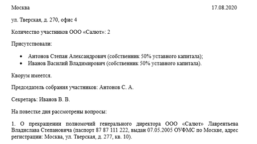 Образец протокола собрания учредителей о смене директора
