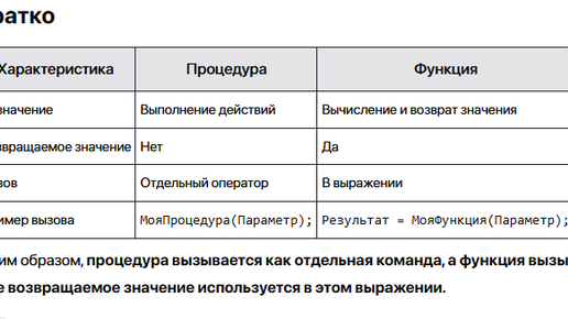 В 1С процедуры и функции – это разные виды подпрограмм, и вызов процедуры и функции отличается. Процедура Функция Процедура вызывается как отдельный оператор. Например: Процедура МояПроцедура(Параметр1, Параметр2) // Код процедуры Сообщить("Вызвана процедура с параметрами: " + Параметр1 + ", " + Параметр2); КонецПроцедуры // Вызов процедуры: МояПроцедура("Значение1", 123); // Вызов процедуры В этом примере МояПроцедура("Значение1", 123); является вызовом процедуры. Мы просто указываем имя процедуры и передаём ей параметры в скобках...