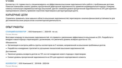 Изучите наш пример резюме коллектора, чтобы понять, как составить документ, который привлечет внимание работодателя. Грамотно составленное резюме — ваш первый шаг к получению желаемой работы. В этом материале вы найдете подробные готовые примеры резюме коллектора как для начинающих, так и для опытных специалистов. Мы предлагаем . Разберем все аспекты: от контактов до навыков, чтобы вы смогли создать по-настоящему эффективное резюме. Изучив пример, вы сможете составить документ, идеально подходящий для вашей цели, а также сможете воспользоваться нашим конструктором резюме...