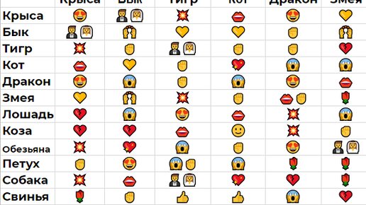 Таблица совместимости знаков согласно восточному календарю. В одной колонке ищем свой знак, в другой - знак партнера. Находим общий смайл и смотрим значение. Значения: 😍 - Хорошая пара, подходят друг другу. 🤵👰- Крепкий и счастливый союз. 💥- Взрывной союз, разные люди - лёд и пламя. 👄 - Долгосрочный союз маловероятен, но попробовать можно. 💛- Счастливые периоды чередуются с разочарованиями. 💔 - Неудачный союз...