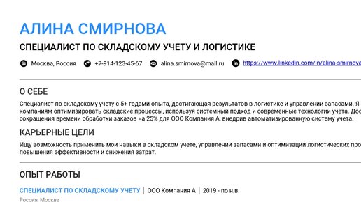 Пример резюме специалиста по складскому учету 2025 - Как составить