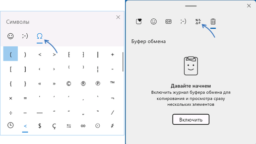 В Windows 11 и Windows 10 присутствует новая панель для вставки эмодзи, просмотра истории буфера обмена и, в том числе, вставки специальных символов. Эта панель незначительно отличается в этих версиях ОС, но принцип использования один и тот же: 3. Выберите символы, которые нужно вставить и вставьте их в месте текущего ввода, нажимая по ним кнопкой мыши — вы можете вставить единственный символ, а можете — несколько по порядку. Способ кажется не слишком удобным, так как нужные символы нужно искать, но по мере использования те из них, которые требуются чаще всего, будут отображаться вверху списка...