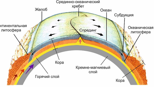 Текст из книги: "Моя Земля. Новый взгляд". Автор: Валерий Лаптев Предыдущая глава: В современной теории тектоники плит, зона спрединга – это зона, расположенная в срединно-океанических хребтах и других рифтовых зонах океана, где происходит разрастание океанического дна. Посмотрим на рисунок, на котором объясняется как строение, так и происходящие процессы, связанные с зоной спрединга. Обратите внимание, что в современном строении Земли, под дном океана, между внешним ядром и литосферой, в мантии есть магматические конвективные ячейки...