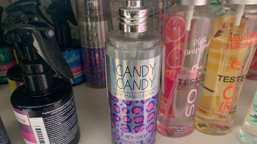 По рекомендации Тиктока заинтерисовалась спреем для тела. Ароматы Victoria's Secret я люблю, поэтому стало любопытно. Неужели они реально похожи? Нашла я этот популярный спрей, называется он "Candy candy", что переводится "конфетка, конфетка". Леопардовое оформление мне не особо нравится, лучше бы нарисовали леденцы. Стоимость небольшая - это 289 рублей за 135 мл. Помечено: "с экстрактом манго". Протестировав аромат, я была в негодовании. Почему его так назвали? Спрей для тела скорее свежий и фруктовый, нежели сладкий...