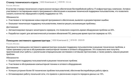 Пример резюме стажера в технический отдел — ваш надежный помощник в подготовке сильного документа. Изучение готовых примеров позволяет быстро создать эффективное резюме, максимально повышая ваши шансы получить желаемую позицию. ✨ В этой статье мы подробно разберем, как составить такое резюме, соответствующее актуальным требованиям работодателей. Вы найдете все необходимое для структурирования и наполнения: Независимо от вашего текущего уровня подготовки, эти материалы помогут вам составить документ, который привлечет внимание рекрутера...
