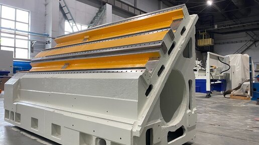 На фото - станина для токарного обрабатывающего центра «Саста» наклонной компоновки серии НТ. Станина — это основной несущий элемент конструкции наших станков. На нее крепятся все остальные подвижные и неподвижные детали и узлы. На нашем заводе мы отливаем станины из серого чугуна марки СЧ-25, чтобы получить массивную и прочную конструкцию, которая сможет прослужить длительный срок. Станина воспринимает на себя все усилия, возникающие при обработке детали и поглощает их, обеспечивая жесткость и виброустойчивость...