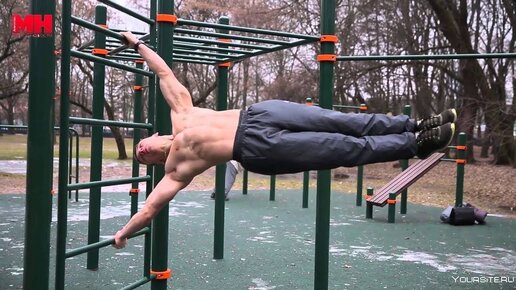 Упражнение «флажок» на турнике — это статический элемент воркаута, при котором тело удерживается горизонтально относительно земли, опираясь на вертикальную опору. Активно работают дельты, спина и кор.