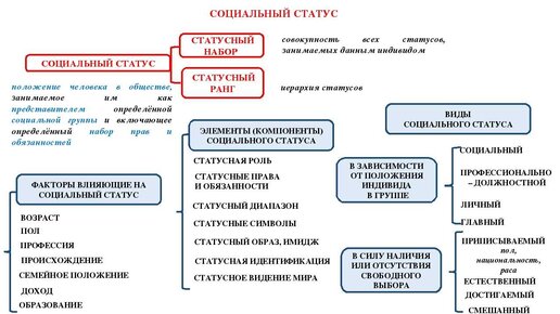 Социальный статус — это положение человека в социальной структуре группы или общества, характеризующееся некоторыми правами и обязанностями и связанное с позициями в других группах. Социальный статус можно определить по специфическим для конкретного общества признакам, например, экономическим, национальным, возрастным и др. Социальный статус разделяется по умениям, навыкам, образованию. Это понятие существует только в процессе сравнения позиции одного человека с другими. Он показывает определенное место в иерархической лестнице, отражая организацию общественной структуры...