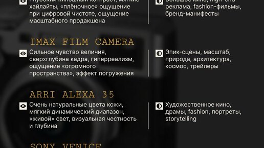 Cinema Studio — это инструмент, где можно создать кинематографичное видео внутри одной платформы, где сам выбираешь, на что снят кадр и как будет двигаться камера. 1️⃣Как работает: • сначала создаём главный кадр, где выбираем из предложенных вариантов на платформе готовые камеру, объектив • далее анимируем его, не переключаясь между разными нейросетями, там же выбираем готовые движения камеры 💡Я сделала для вас шпаргалку по камерам, объективам и линзам, чтобы вы могли уверенно их использовать...