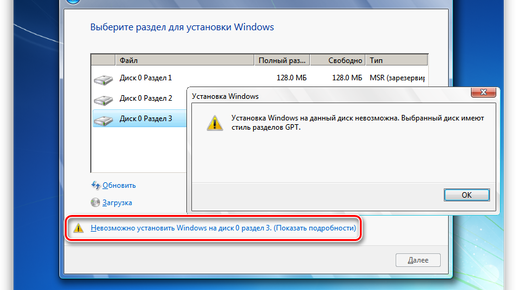 Ошибка при установке Windows. Выбраный диск имеет стиль разделов GPT.