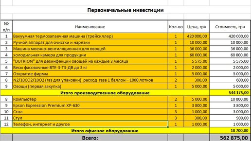 В данной статье рассмотрим расчет производства 15 видов продукции из 20 материалов/ингридиентов/комплектующих. Расчет сделан на три года с получением три основных форм: Непосредственно в рассматриваемом файле расчет определяет прибыльность бизнеса по резке и фасовке овощей и фруктов, но данный расчет можно использовать при расчете других видов производств. Это уже зависит от вашей фантазии. Итак, первый лист: Лист «Инвестиции» Элементарная таблица, в которой оранжевым цветом выделены ячейки в которые вы вносите данные вручную...