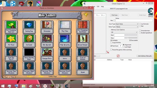 Доброго времени суток, уважаемые читатели. Если Вы зашли сюда, то скорее всего Вас интересует, как попасть на страницу с секретными мини-играми в PvZ. Сейчас я расскажу Вам, как это делается. Для начала, нам понадобится включить саму игру и программу Cheat Engine. В Cheat Engine нажимаем на кнопку с компьютером и лупой. Затем в появившемся окне выбираем Plants vs Zombies и нажимаем Open. Далее нажимаем на Memory View. В появившемся окне жмём правой кнопкой мыши по первой вкладке и выбираем Go to address...