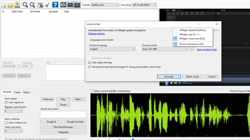 Анализ функции аудио в текст с помощью Whisper в Subtitle Edit 3.6.12